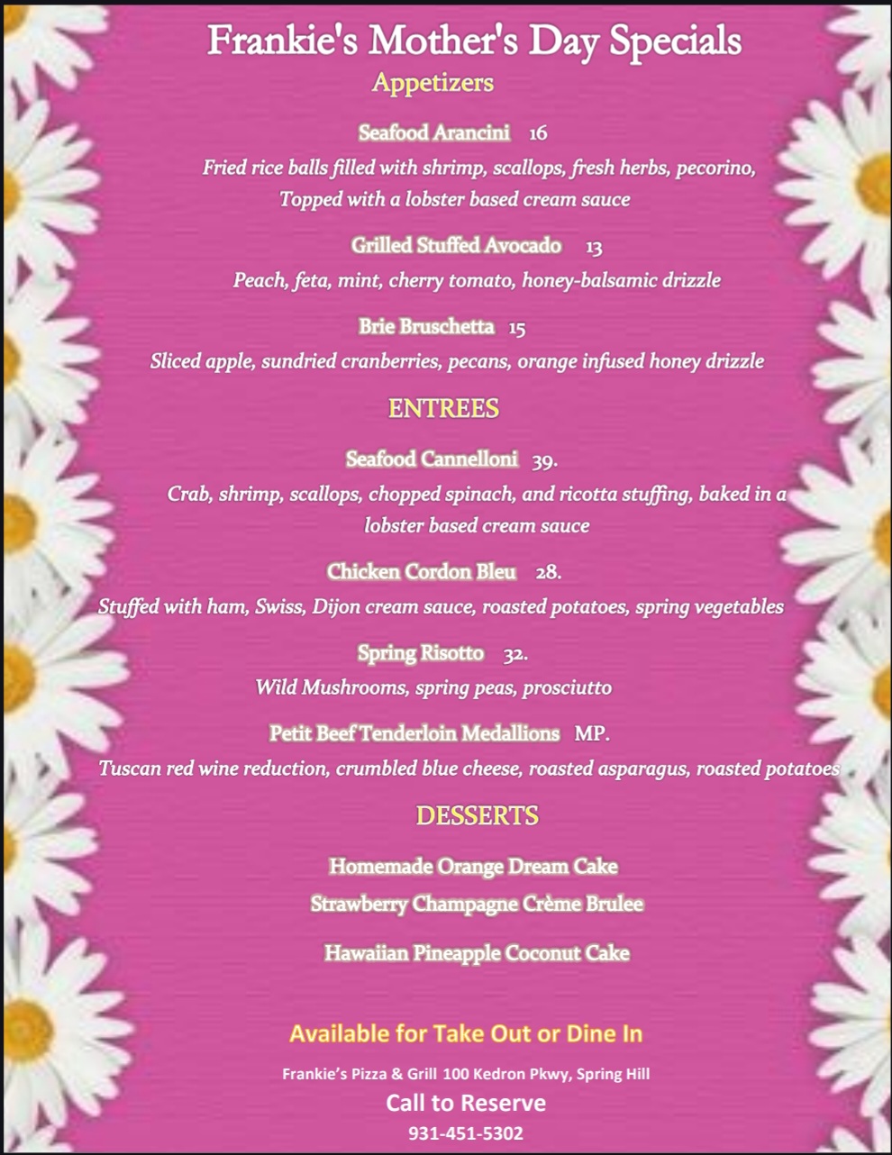 In Spring Hill, Tennessee, Frankie’s isn’t just a restaurant — it’s a tradition. Recipes passed down like heirlooms, from rich, slow-simmered ragù alla Bolognese to delicate, hand-layered lasagna and perfectly balanced chicken parmigiana. Sauces are given time, never rushed. Dough is shaped with care, whether it becomes a crisp, wood-fired pizza or tender, house-made pasta. At Frankie’s, we honor the old ways: slow cooking, honest ingredients, and hospitality that means something — the kind you taste in every bite of a classic spaghetti carbonara or a simple, perfect margherita pizza."